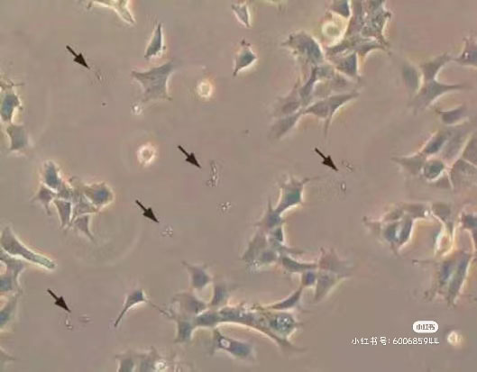 現(xiàn)象3:培養(yǎng)過程中細(xì)胞增殖突然變慢,培養(yǎng)基中黑點(diǎn)、碎片明顯增多,培養(yǎng)基PH變化(變黃)周期變短,那么細(xì)胞很可能已經(jīng)感染了支原體。