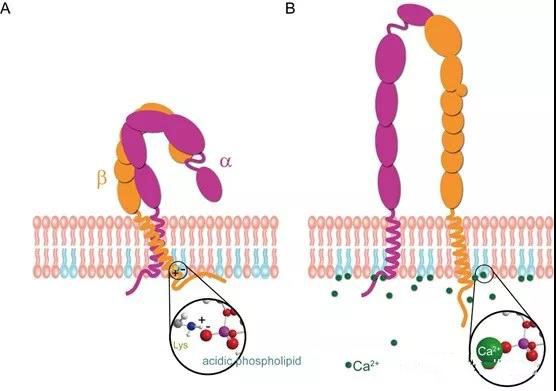 在靜息狀態(tài)下,酸性磷脂通過與?2-K702和?L形成三元相互作用穩(wěn)定跨膜區(qū)異源二聚體構(gòu)象,從而將整合素維持在低親和力構(gòu)象。T細(xì)胞活化引起鈣離子內(nèi)流,內(nèi)流的鈣離子通過與酸性磷脂競爭性結(jié)合,打破靜息狀態(tài)下的三元靜電作用,引起整合素跨膜區(qū)異源二聚體的分離...